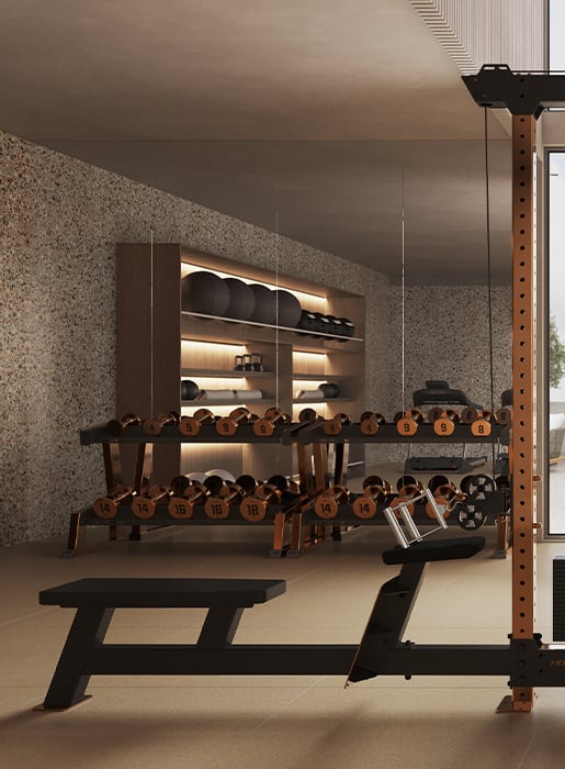 Materialien und Farben werden sorgfältig ausgewählt, um den Stil deines Zuhauses zu ergänzen und gleichzeitig eine optimale Trainingsatmosphäre zu schaffen. Wir setzen auf hochwertige, langlebige Materialien, die Eleganz und Widerstandsfähigkeit in den Raum bringen. Die Farbauswahl ist darauf abgestimmt, Energie und Fokus zu fördern – sei es durch belebende Töne, die zu Bewegung inspirieren, oder neutrale Nuancen, die Ruhe und Konzentration unterstützen.