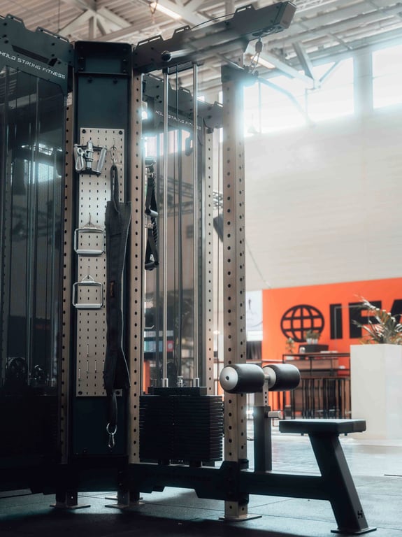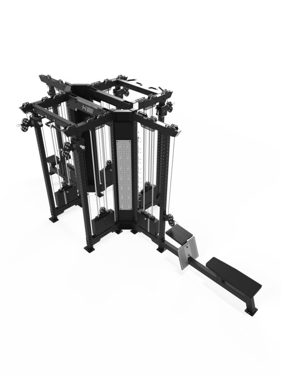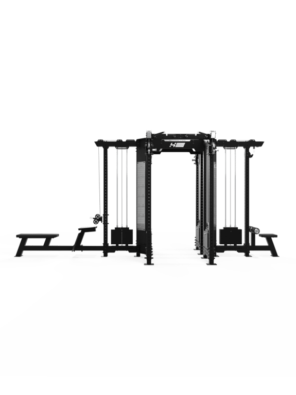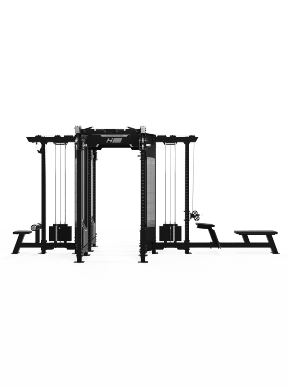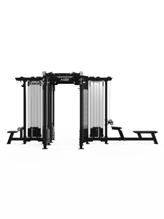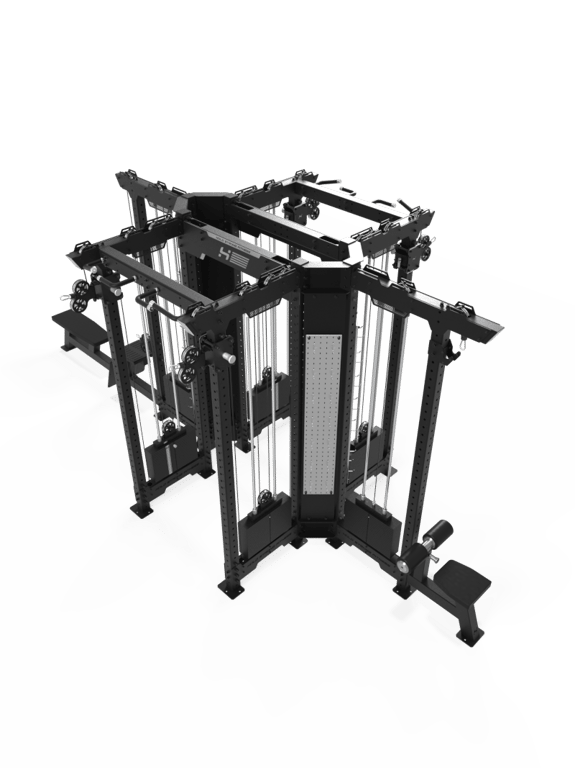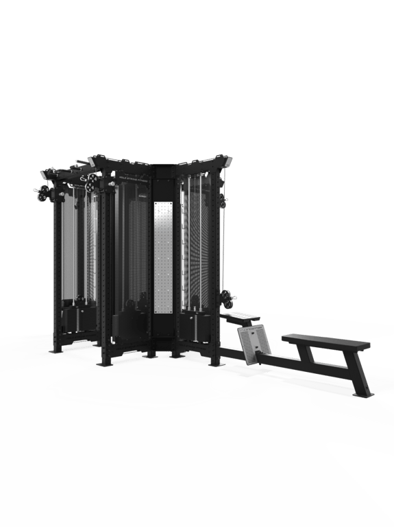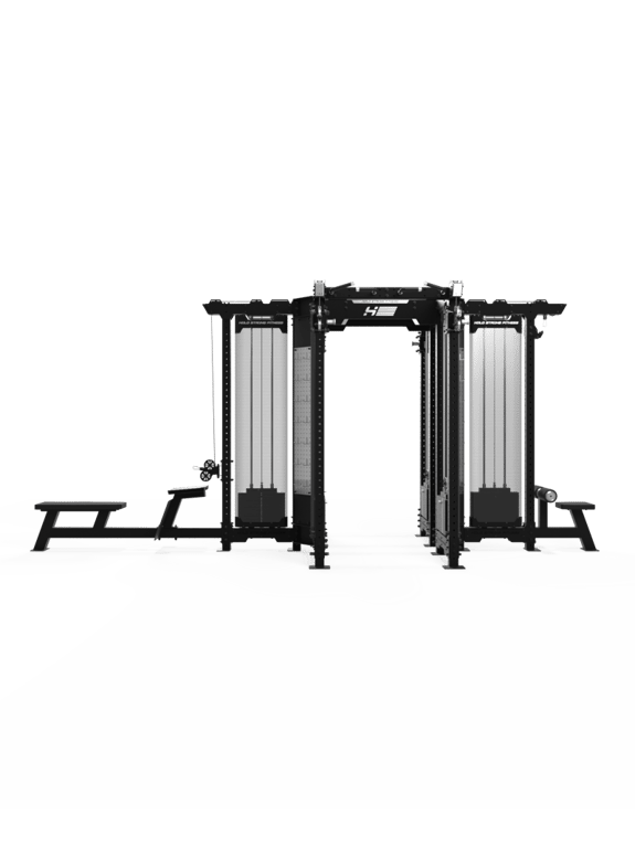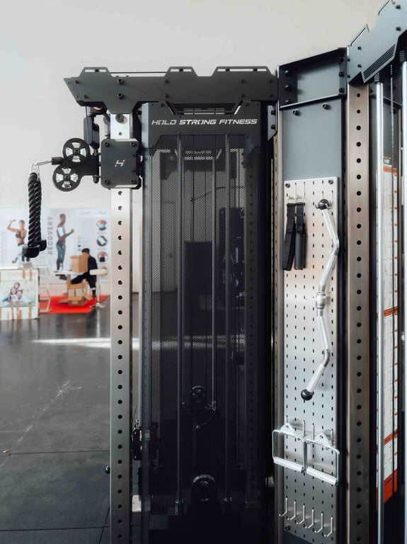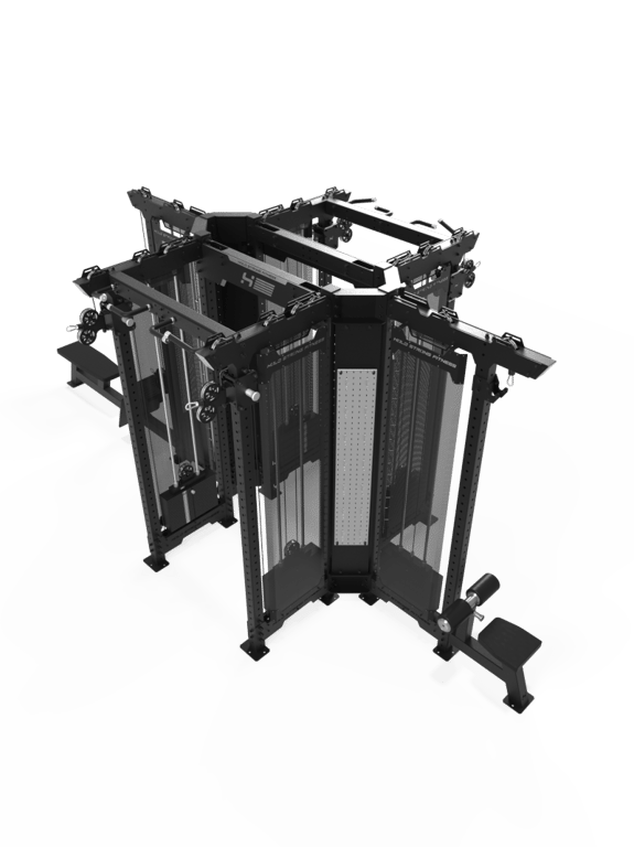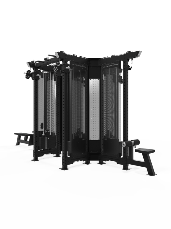 Das Athletic Performance Rack VIII von HOLD STRONG Fitness ist eine durchdachte Lösung für Fitnessstudios, Personal-Training-Räume und Firmenfitnessbereiche, die funktionelles Krafttraining auf begrenztem Raum ermöglichen möchten. Neben seiner robusten Konstruktion überzeugt dieses Rack mit einem hochwertigen, ästhetischen Design, das sich nahtlos in moderne Gym-Konzepte einfügt. Klare Linien, eine präzise Verarbeitung und optionale individuelle Branding-Möglichkeiten machen das Rack zu einem optischen Highlight, das nicht nur funktional, sondern auch stilvoll in jedes Fitnessstudio passt. Durch die Kombination aus zwei Racks, einer Latzugstation, einer Ruderstation und vier höhenverstellbaren Kabelzugstationen bietet dieses System eine außergewöhnliche Vielseitigkeit für verschiedene Trainingsmethoden. Die kompakte Bauweise ermöglicht ein effektives Training für bis zu sechs Personen gleichzeitig – ideal für Personal Training, Kleingruppentraining oder Zirkeltraining.