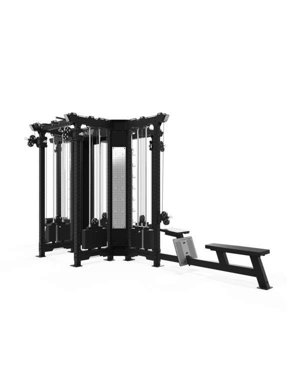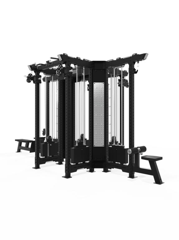 Dieses leistungsstarke System integriert zwei vollwertige Power Racks, ergänzt durch höhenverstellbare Kabelzugstationen, eine Latzugstation auf der einen und eine Ruderstation auf der anderen Seite. Dank dieser durchdachten Konstruktion können Trainierende sowohl klassische Langhantelübungen als auch gezieltes Seilzugtraining für Rücken, Arme, Brust und Schultern absolvieren. Während zwei Personen gleichzeitig an den Ruder- und Latzugstationen trainieren, können am Rack Langhantelübungen und Kabelzugübungen absolviert werden. Zusätzlich können vor dem Rack Hantelbänke, Kettlebells oder Kurzhanteln genutzt werden, wodurch weitere Sportler in das Training eingebunden werden können. Diese Struktur macht das Athletic Performance Rack VIII zu einer idealen Wahl für Gyms, die ein vielseitiges Training auf begrenztem Raum ermöglichen möchten.