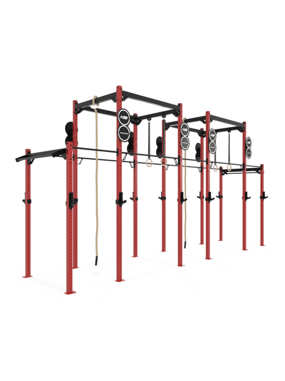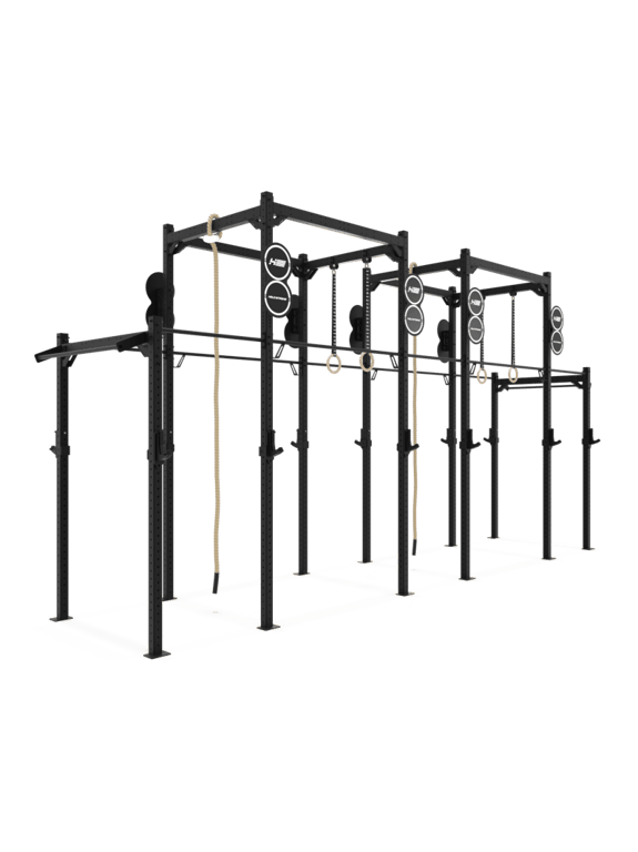 Ausgestattet mit sechs Freihantelstationen für klassische Langhantelübungen wie Squats, Bankdrücken, Kreuzheben und Schulterdrücken, ermöglicht dieses Rig ein umfassendes Krafttraining. Verschiedene Klimmzugstangen sorgen für abwechslungsreiche Oberkörperübungen, während zwei Türme mit Kletterseilen und Gym Rings funktionelle Workouts und anspruchsvolle Ganzkörperübungen ermöglichen. Jede Komponente ist so konzipiert, dass sie höchsten Belastungen standhält und ein sicheres Training gewährleistet.