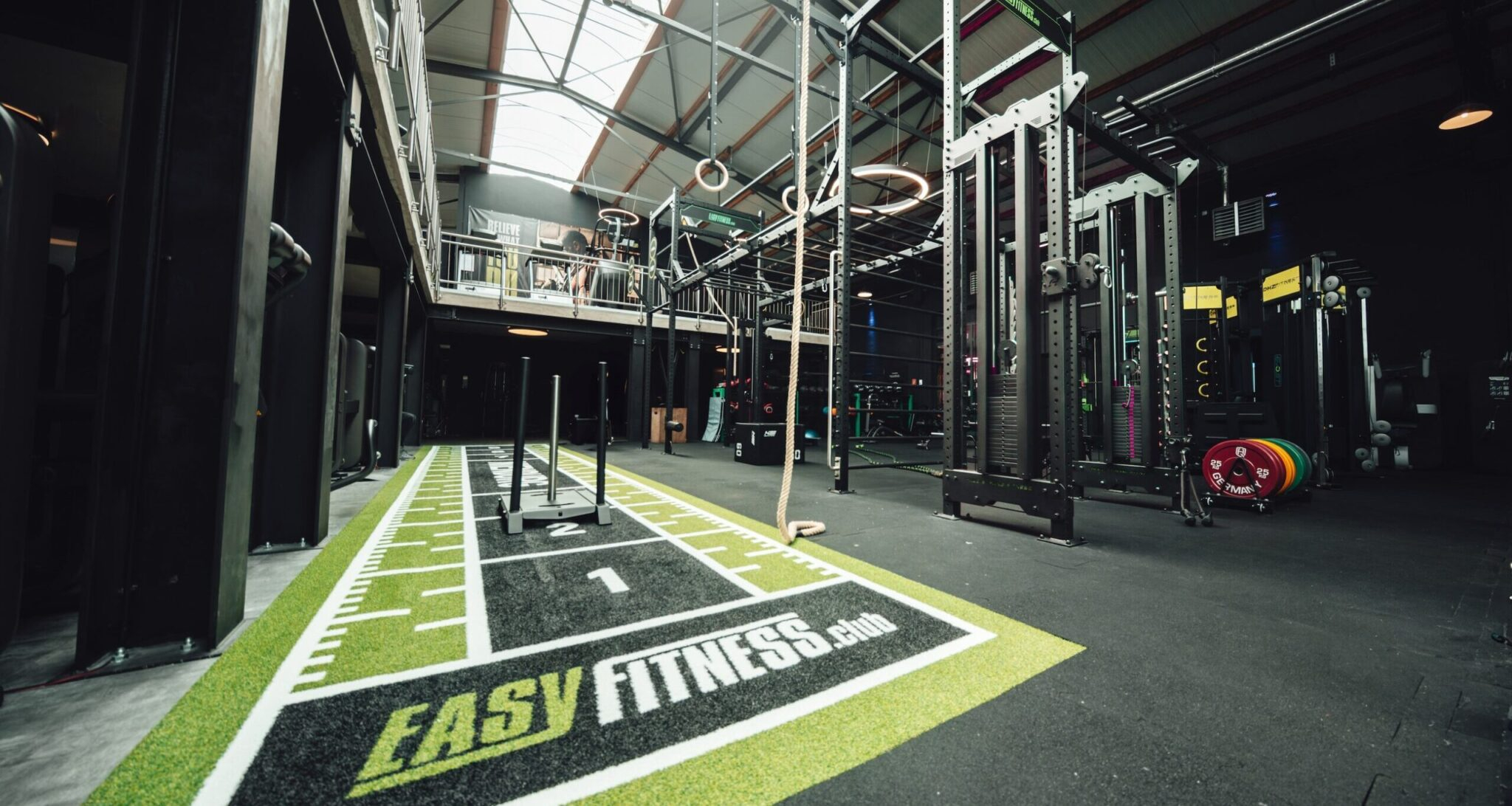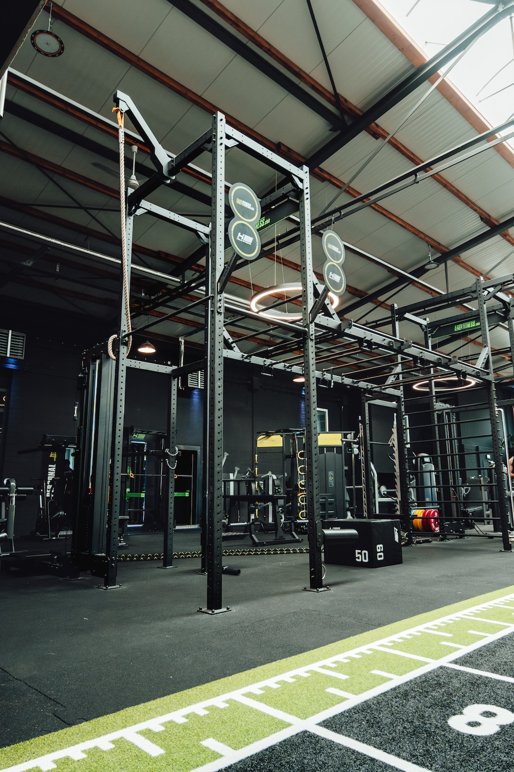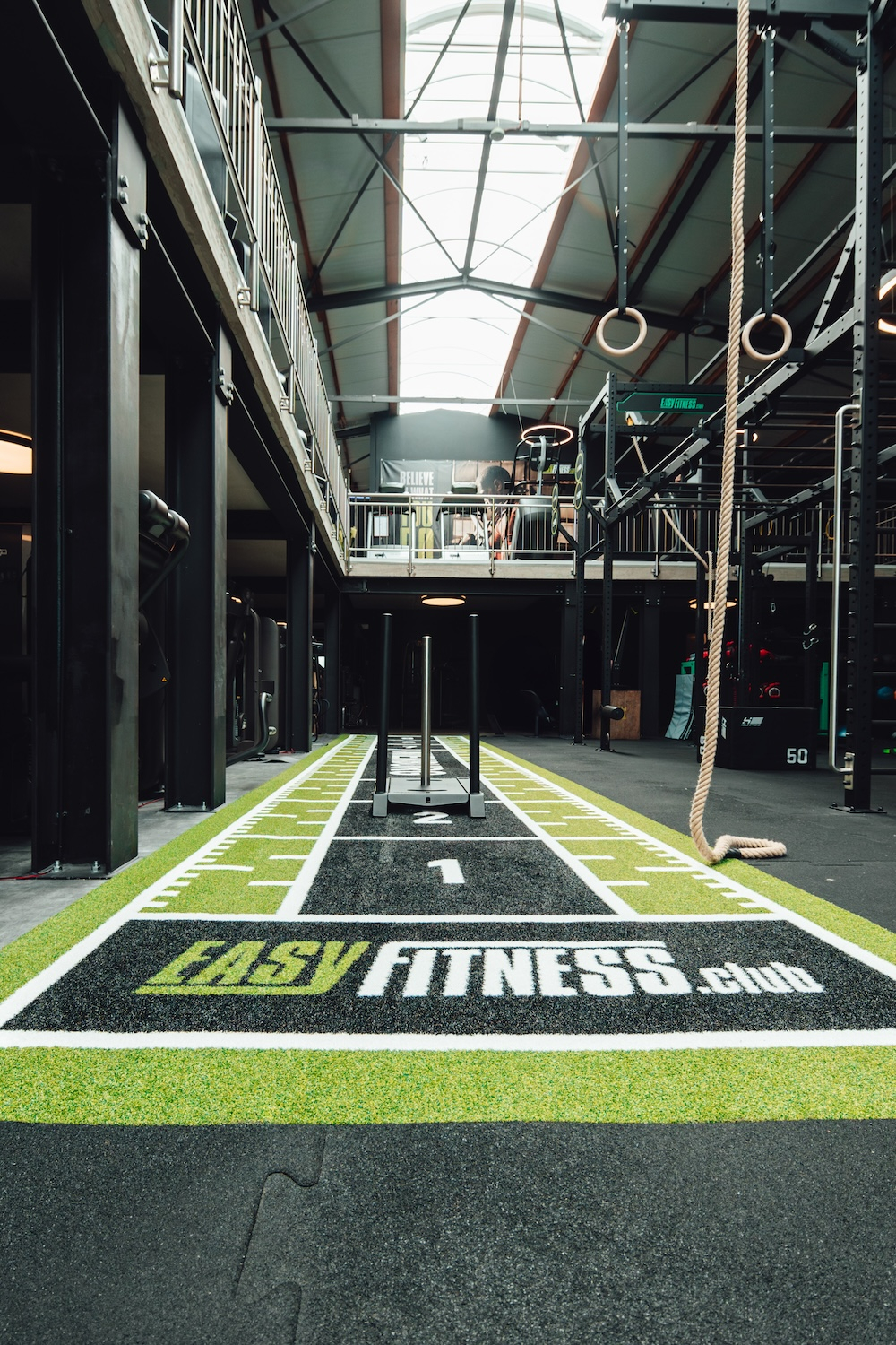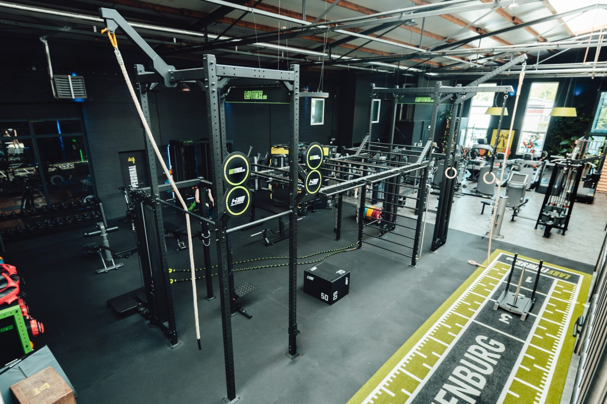 Der Boden des Functional-Fitness-Bereich im EASYFITNESS Nienburg überzeugt durch ein durchdachtes Flächendesign. Der speziell angefertigte Turf sowie der Bodenbelag wurden im Look & Feel der Marke gestaltet – inklusive integriertem EASYFITNESS-Logo und abgestimmter Farbgebung in den CI-Grüntönen der Gymkette. So entsteht nicht nur eine funktionale Trainingsumgebung, sondern auch ein starker visueller Wiedererkennungswert, der das Markenerlebnis bis ins Detail transportiert.